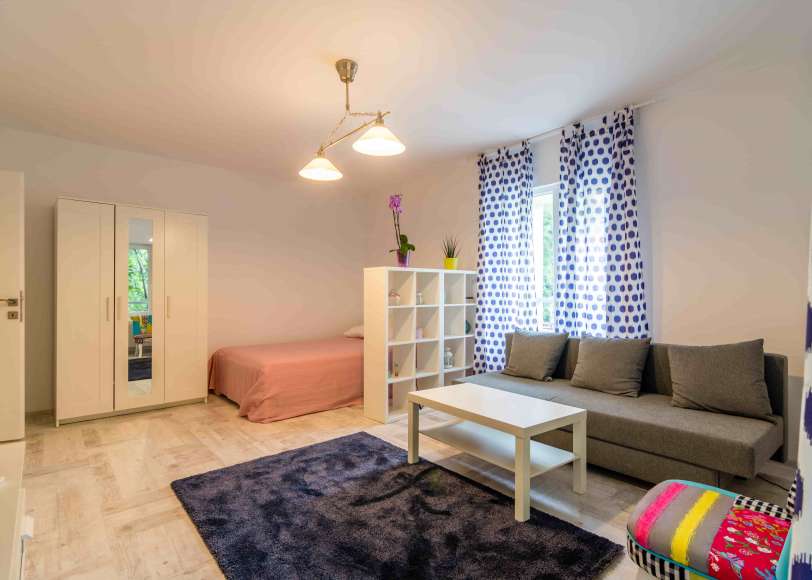 Proprietatea este spatioasa, luminoasa, proaspat renovata, dotata cu mobilier si electrocasnice care se imbina armonios in locatia in care ar trebui sa te simti ca acasa. Garsoniera dispune de un pat matrimonial de 160cm x 200cm, Smart TV, un dulap mare, o canapea extensibila, un balcon spatios cu vedere la gradina unde puteti savura un ceai sau cafea facute la espressorul din bucatarie cu capsule Bosch Tassimo. Apoi te poți relaxa în baia cu o cadă sau poți găti ceva în cuptorul electric.